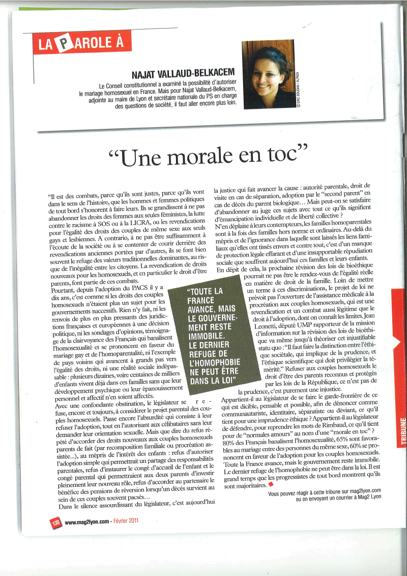 Ci dessous, la tribune que je viens de signer dans “Mag2Lyon” de février 2011 sur l’ouverture du mariage et de la parentalité aux couples de même sexe…