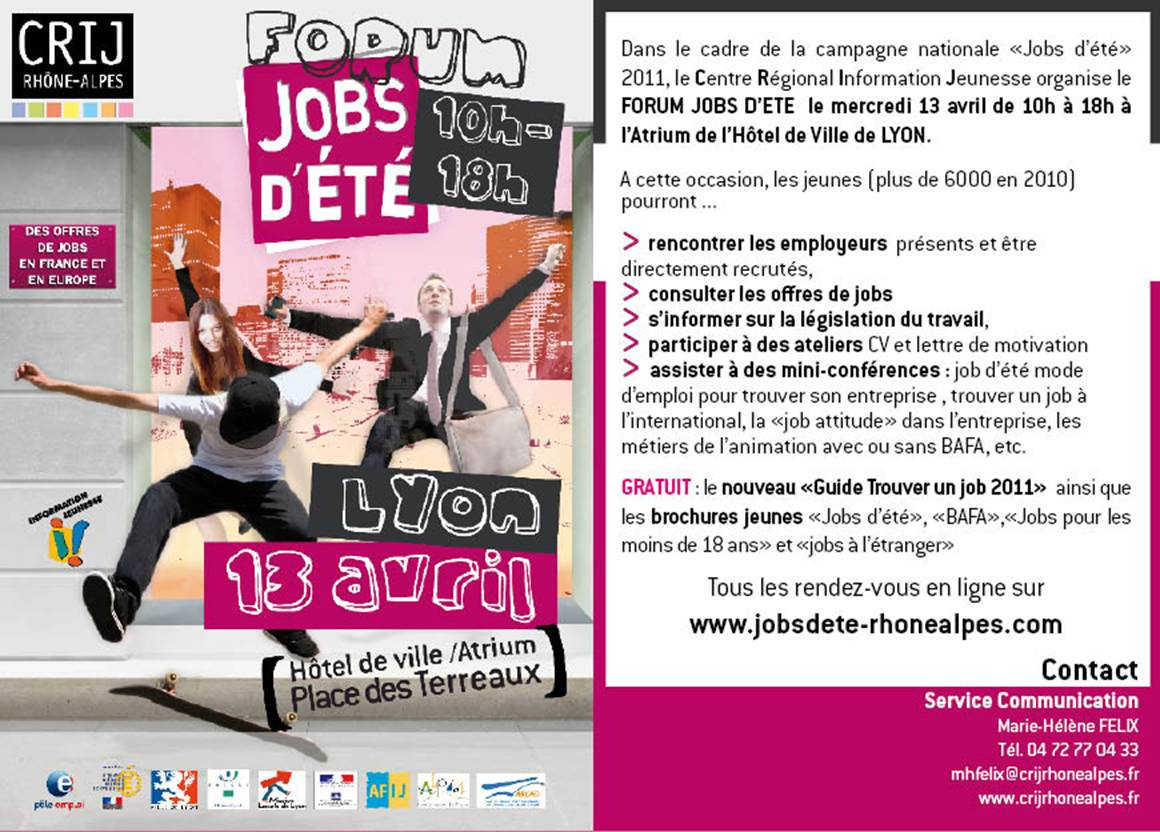 Tags : 2011, AFIJ, BAFA, CRIJ, CV, Centre Régional Information Jeunesse, Direction départementale du travail, Jobs d'été, Mission locale, Pole emploi, Rhône-Alpes, Urssaf, Ville de Lyon, animation, emploi, entreprise, forum, international, jeunesse, job, job attitude, lettre de motivation, offres, temporaire, travail, été