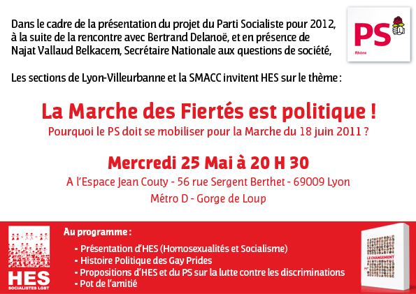 D’abord Mercredi 25 mai à 20h30, à l’espace Jean Couty (56 rue Sergent Berthet-69 009 Lyon) avec le groupe de Lyon d’Homosexualités et Socialisme (HES):