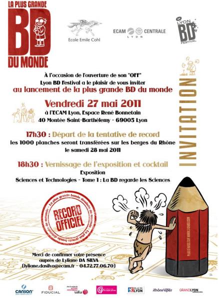 C’est parti ! Nous voici au lancement de Lyon BD Festival avec cette prouesse jamais atteinte encore : 1 km de bande dessinée réalisée en une nuit blanche par les étudiants de l’Ecole Émile Cohl, l’Ecam et l’Ecole Centrale. Détenu jusqu’alors par l’Inde, le record du monde de la plus grande bande dessinée revient en Europe, en France, et à Lyon !