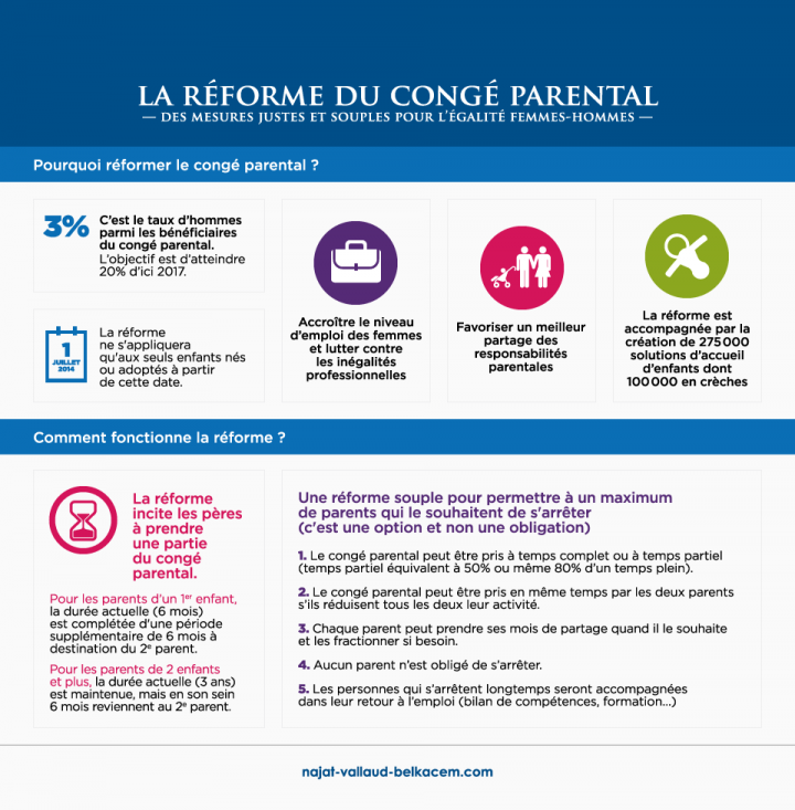 Le projet de loi pour l’Égalité entre les femmes et les hommes introduit une réforme du congé parental qui pour objectif d’accroitre le niveau d’emplois des femmes, de lutter contre les inégalités professionnelles et de favoriser le partage des responsabilités parentales.