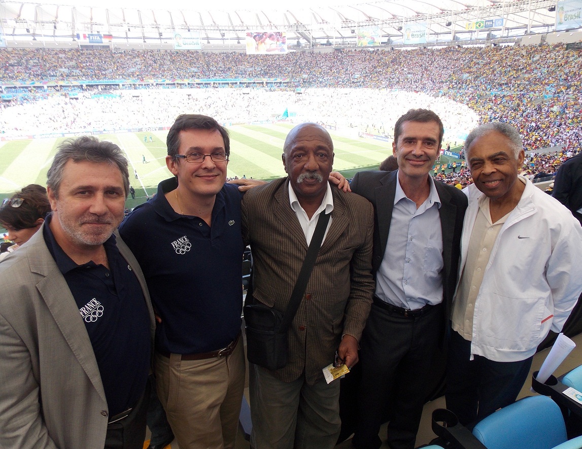 Guillaume Pierre, Attaché culturel, Brice Roquefeuil, Consul Général, Paulo Cesar Caju, champion mondial de football, Jean-Charles Ledot, Consul Général Adjoint et Gilberto Gil côte à côte pour supporter les Bleus.