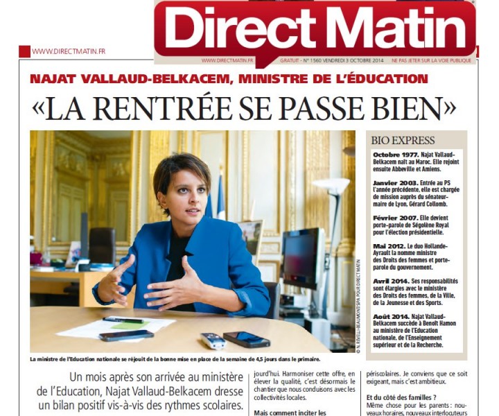 Un mois après son arrivée au ministère de l’Éducation, Najat Vallaud-Belkacem dresse un bilan positif vis-à-vis des rythmes scolaires dans un entretien à DirectMatin.