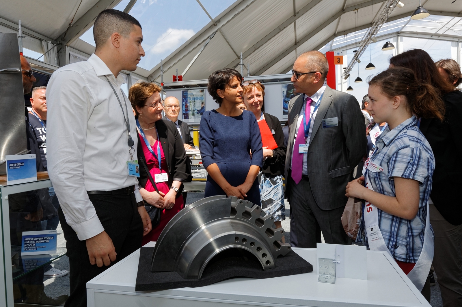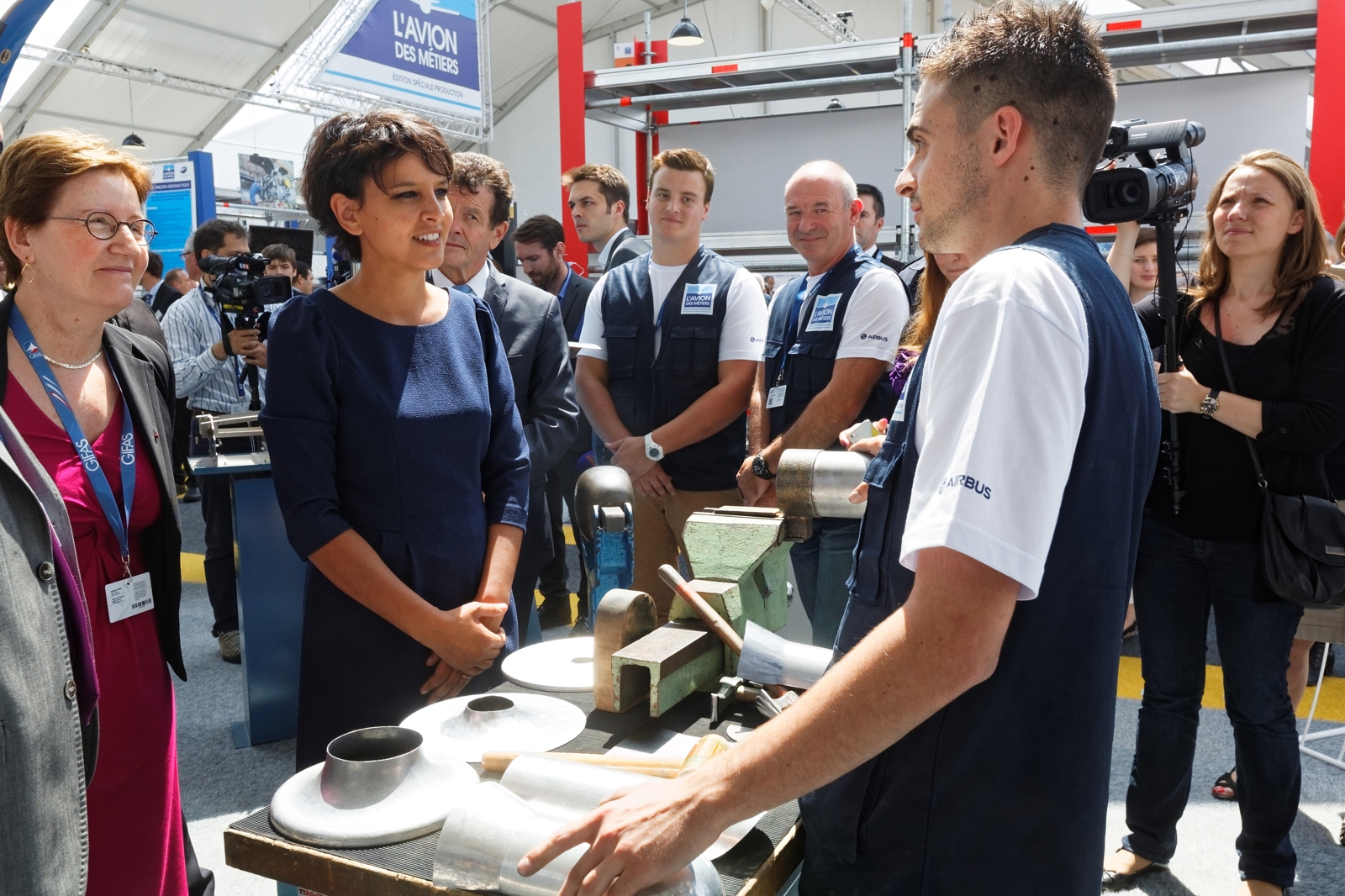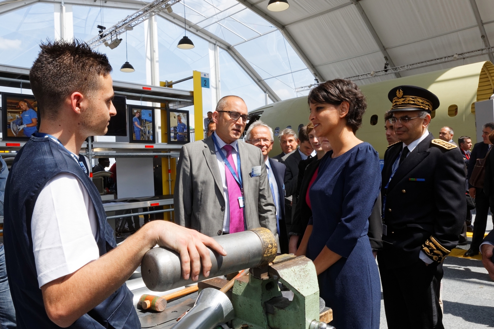 La ministre a visité l’Avion des Métiers du Salon qui présente, aux jeunes et à leurs parents et professeurs, quinze métiers liés à la production aéronautique et spatiale. Métiers qui sont présentés par des salariés des entreprises avec pour objectif de renforcer leur attractivité.