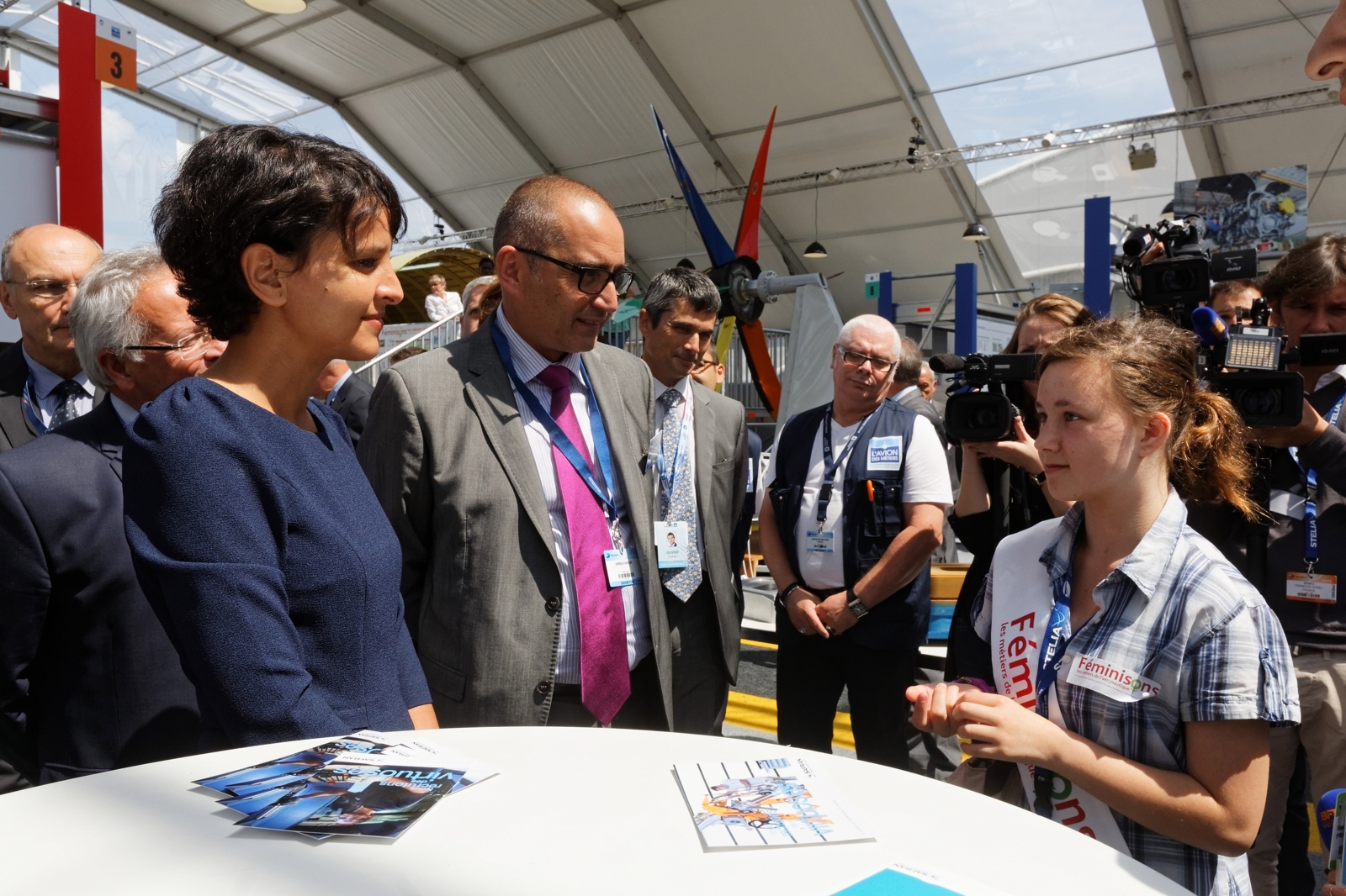 Najat Vallaud-Belkacem, ministre de l’Éducation nationale, de l’Enseignement supérieur et de la Recherche, s’est rendue au Salon international de l’Aéronautique et de l’Espace de Paris au Bourget (Seine-Saint-Denis), ce mardi 16 juin 2015.