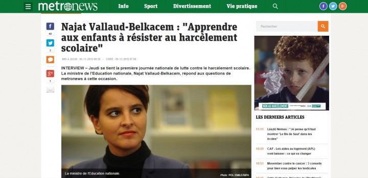 Ce jeudi 5 novembre 2015 se tenait la première journée nationale de lutte contre le harcèlement scolaire. La ministre de l’Éducation nationale, de l’Enseignement supérieur et de la Recherche, Najat Vallaud-Belkacem, répondait à cette occasion aux questions du journal Metronews .