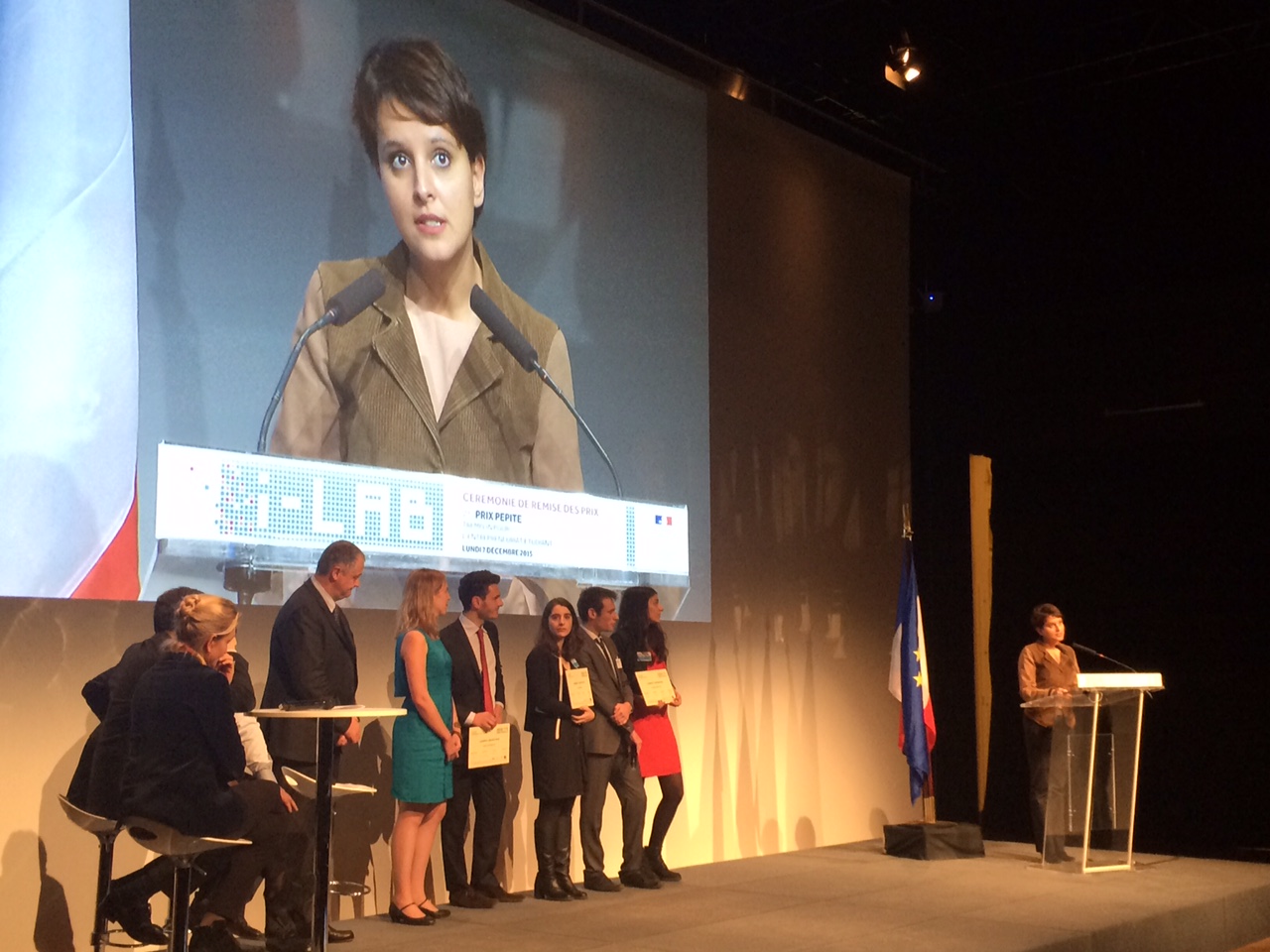 La ministre Najat Vallaud-Belkacem a salué les étudiants-lauréats, d’une moyenne d’âge de 24 ans, qui “incarnent une jeune porteuse d’innovation”. Parmi les lauréats, 3 projets ont été distingués par un grand prix remis par les ministres et par la Caisse des Dépôts.