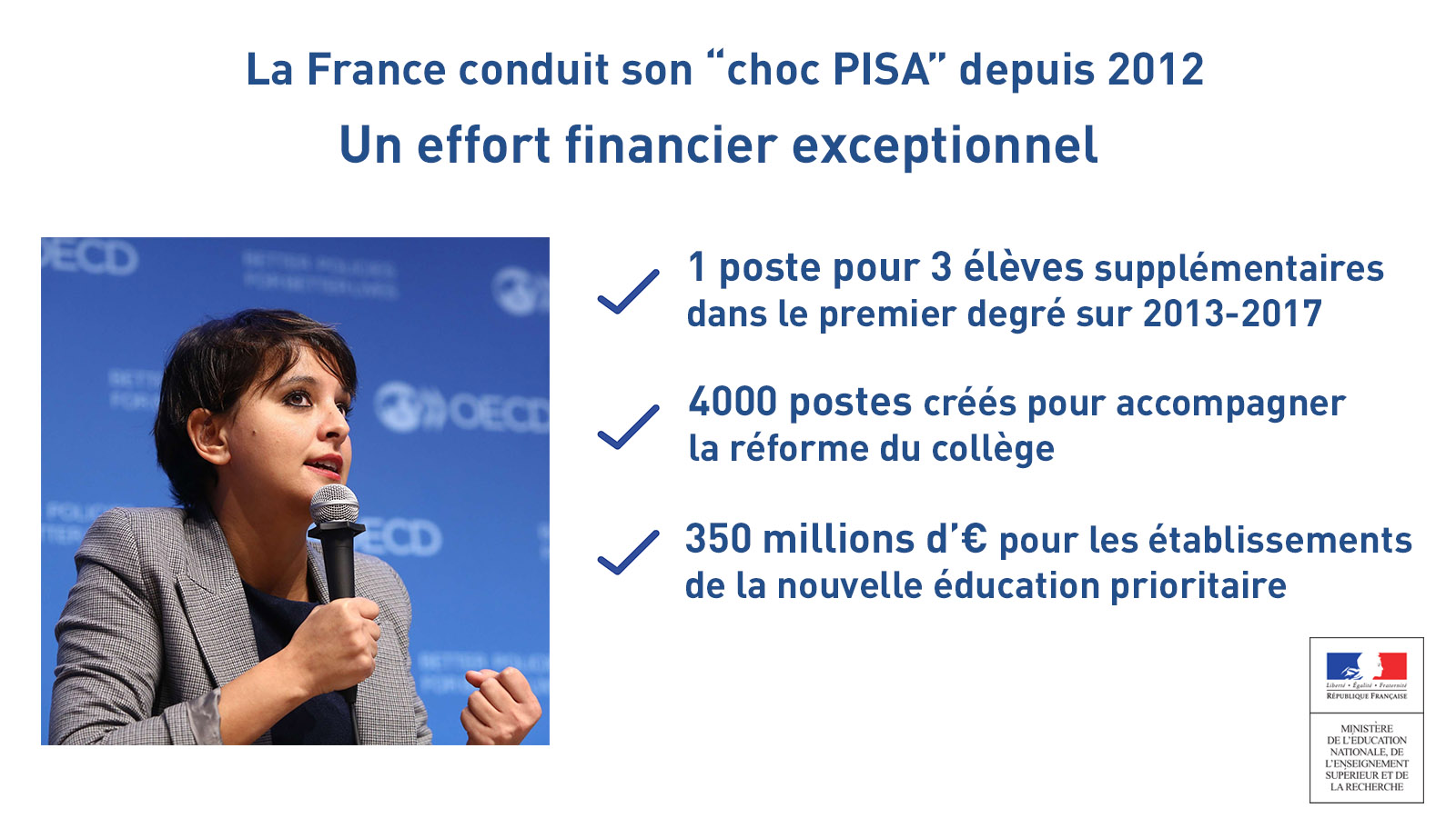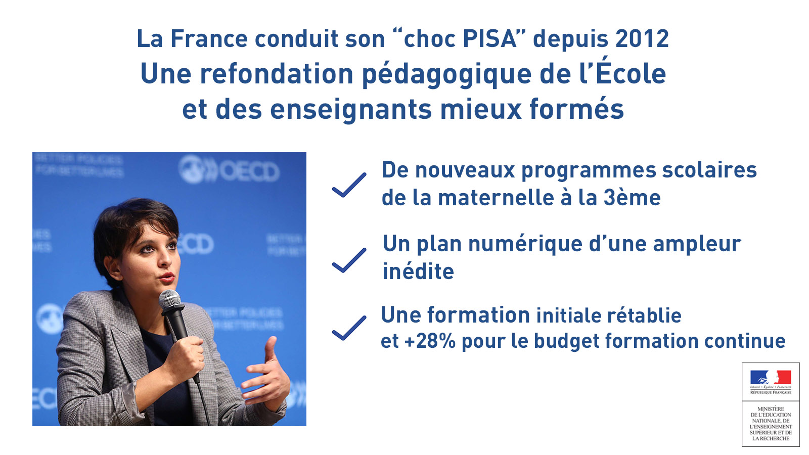 “Face à ces constats, déjà posés par mon prédécesseur Vincent Peillon au moment de la publication des résultats PISA 2012, et cela a été une vertu importante des évaluations PISA, la France a entrepris son “choc PISA”, a-t-elle ajouté. C’est la Refondation de l’École conduite depuis le début de ce quinquennat.