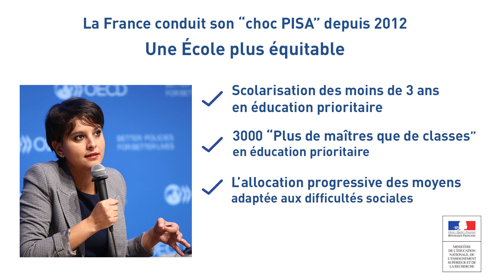 La publication des résultats PISA, dont le domaine majeur d’évaluation en 2015 étaient les sciences, est un moment attendu par la communauté éducative et par l’ensemble du pays. “Ce moment d’évaluation nous permet de voir d’où nous partons et où nous allons“, a réagi Najat Vallaud-Belkacem, qui s’est réjoui de pouvoir présenter ces résultats conjointement avec Gabriela Ramos, à l’OCDE. “C’est une première.”