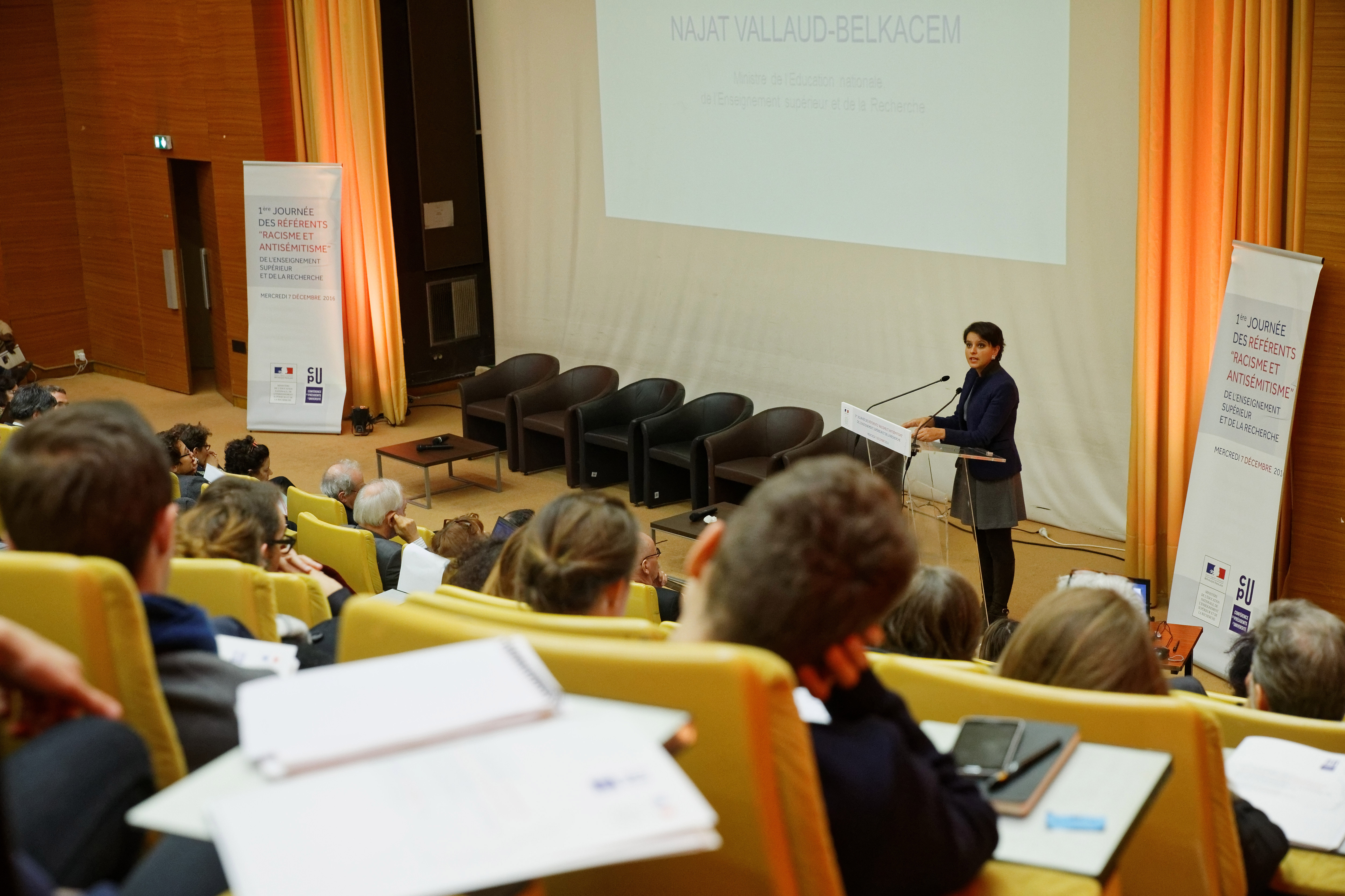 Najat Vallaud-Belkacem, ministre de l’Éducation nationale, de l’Enseignement supérieur et de la Recherche, s’est rendue mercredi 7 décembre à la première journée des référents “racisme et antisémitisme” de l’ESR, organisée avec la Conférence des présidents d’Université (CPU). La désignation de ces référents dans les établissements était prévue dans le cadre de la “Grande mobilisation de l’École pour les valeurs de la République”. Lire le discours de la ministre.