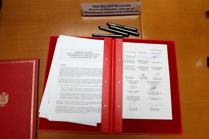 Najat Vallaud-Belkacem, ministre de l’Education nationale, de l’Enseignement supérieur et de la Recherche et Thierry Mandon, secrétaire d’Etat chargé de l’Enseignement supérieur et de la Recherche, ont signé jeudi 4 mai un protocole d’accord majoritaire portant sur les conditions d’accès des personnels ouvriers des Crous à la fonction publique de l’Etat, aux côtés d’Emmanuel Giannesini, président du Cnous, et avec trois organisations représentatives des personnels des Crous (UN CGT CROUS, SGEN CFDT, SNASUB FSU) et de la fonction publique (UFSE-CGT, UFFA-CFDT, FSU). Les organisations signataires représentent 67,3% des personnels des Crous, donnant ainsi à ce protocole signé avec l’Etat et le Cnous la légitimité d’un accord majoritaire.
